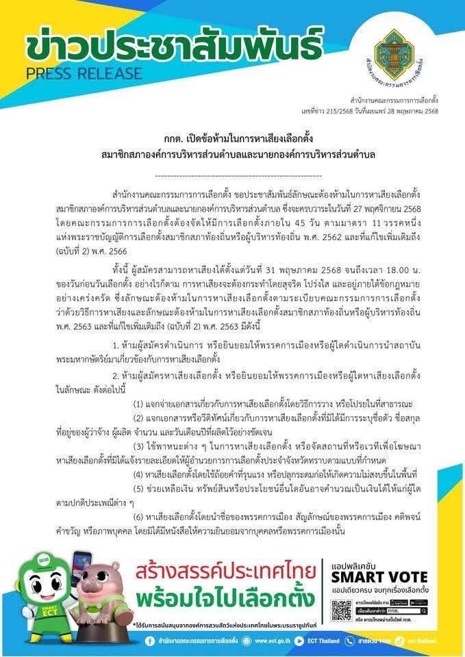 ประชาสัมพันธ์สำนักงานคณะกรรมการการเลือกเลื้อง เปิดข้อห้ามในการหาเสียงเลือกตั้งสมาชิกสภาองค์การบริหารส่วนตำบลและนายกองค์การบริหารส่วนตำบล