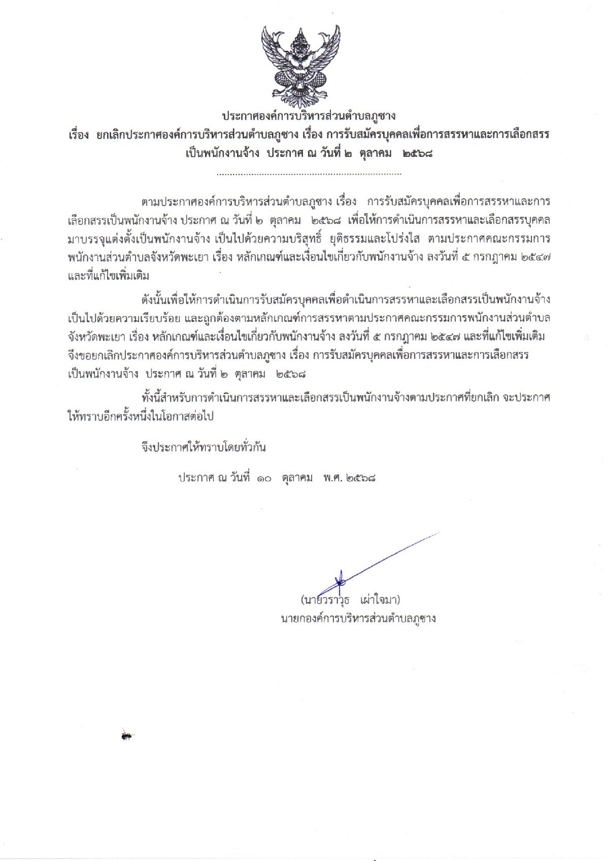 ประกาศองค์การบริหารส่วนตำบลภูซาง เรื่อง ยกเลิกประกาศองค์การบริหารส่วนตำบลภูซาง เรื่อง การรับสมัครบุคคลเพื่อการสรรหาและการเลือกสรรเป็นพนักงานจ้าง ประกาศ ณ วันที่ 2 ตุลาคม 2568