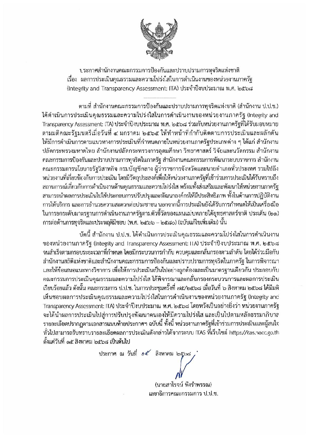 ประกาศสำนักงานคณะกรรมการป้องกันและปราบปรามการทุจริตแห่งชาติเรื่องผลการประเมินคุณธรรมและความโปร่งใสในการดำเนินงานของหน่วยงานภาครัฐ (ITA)